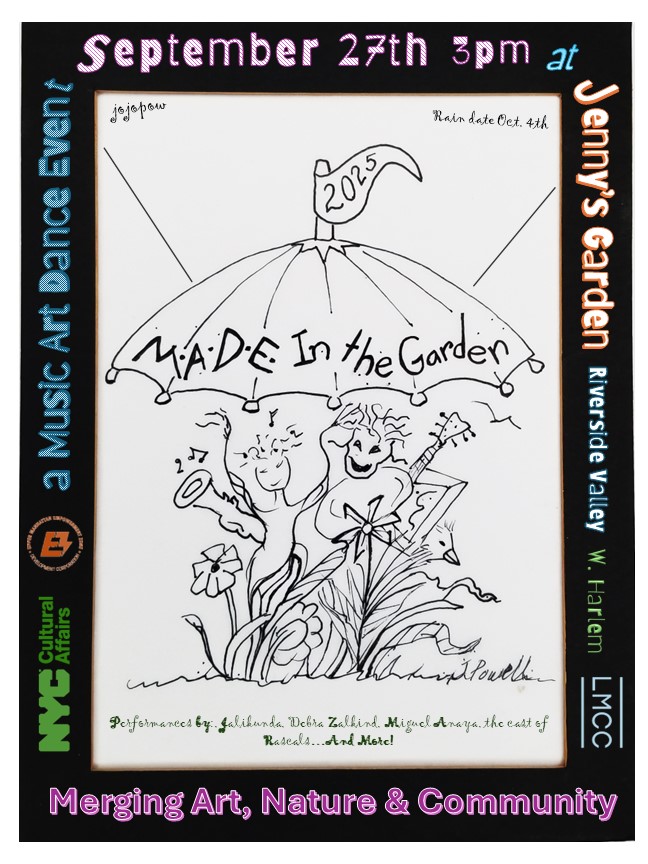 Riverside Valley Community Garden ("Jenny's Garden") Riverside Valley Community Garden, NYJoin dancers, musicians, and theater artists from M.A.D.E. in the Garden for interactive site-specific performances. Rain date October 4.