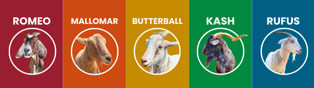 Kash, a cashmere goat with long, flowing locks, proudly has the longest horns of all of the goats at the Green Goats farm. Always one to prance to the beat of his own drum, he was once the lone goat living on a horse farm, and you can still find him trotting about, showing off his handsome features with panache.