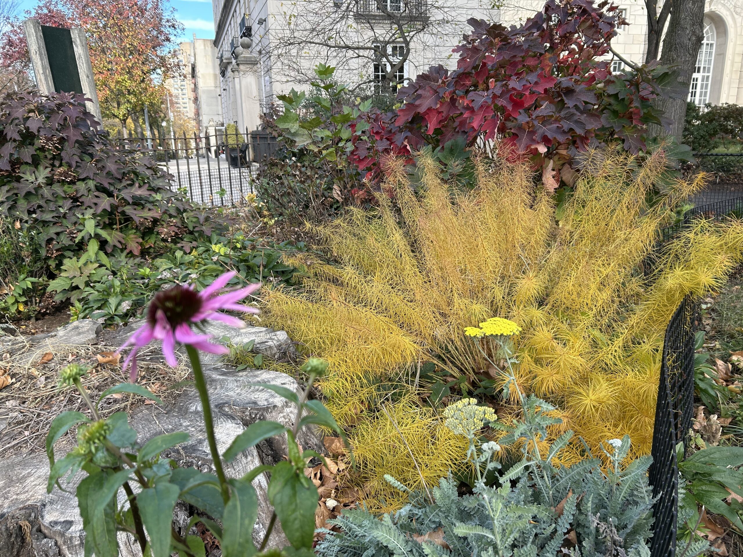 Leaving the leaves is a widely accepted strategy to ensure that pollinators have safe spaces to overwinter, and trees can utilize the little nutrient packets they spent all year creating. You may see staff using lawn mowers and leaf vacuums to move around and process leaves to create a broken-down leaf mulch that can be used in more formal areas like entrance gardens. In our natural areas we leave leaves in larger amounts to harbor any overwintering caterpillars (and fireflies!) Check out what NYC Parks has to say about leaves! This practice helps us reduce the need for water as the rich mulch helps to retain moisture in the soil and also suppresses weeds.Â
