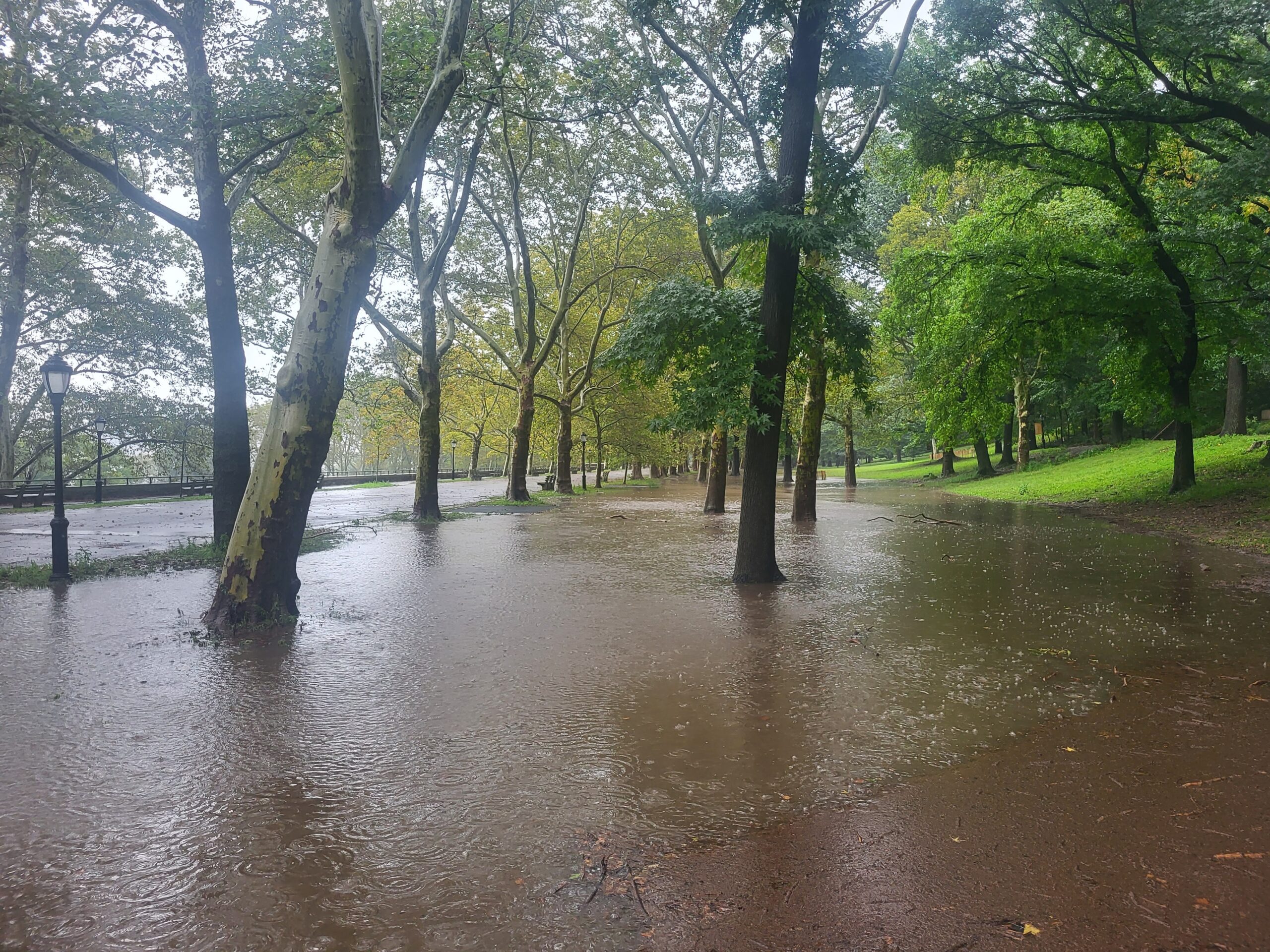 Drainage is a major challenge in Riverside Park. Originally designed by Frederick Law Olmsted and expanded under Robert Moses in the mid-1930s, the park’s river-facing slope and 90-year-old infrastructure—plus a paved perimeter that channels street runoff—create heavy surface water, now intensified by extreme storms. Working with Riverside Park Conservancy and the community, NYC Parks secured funding to address these issues.